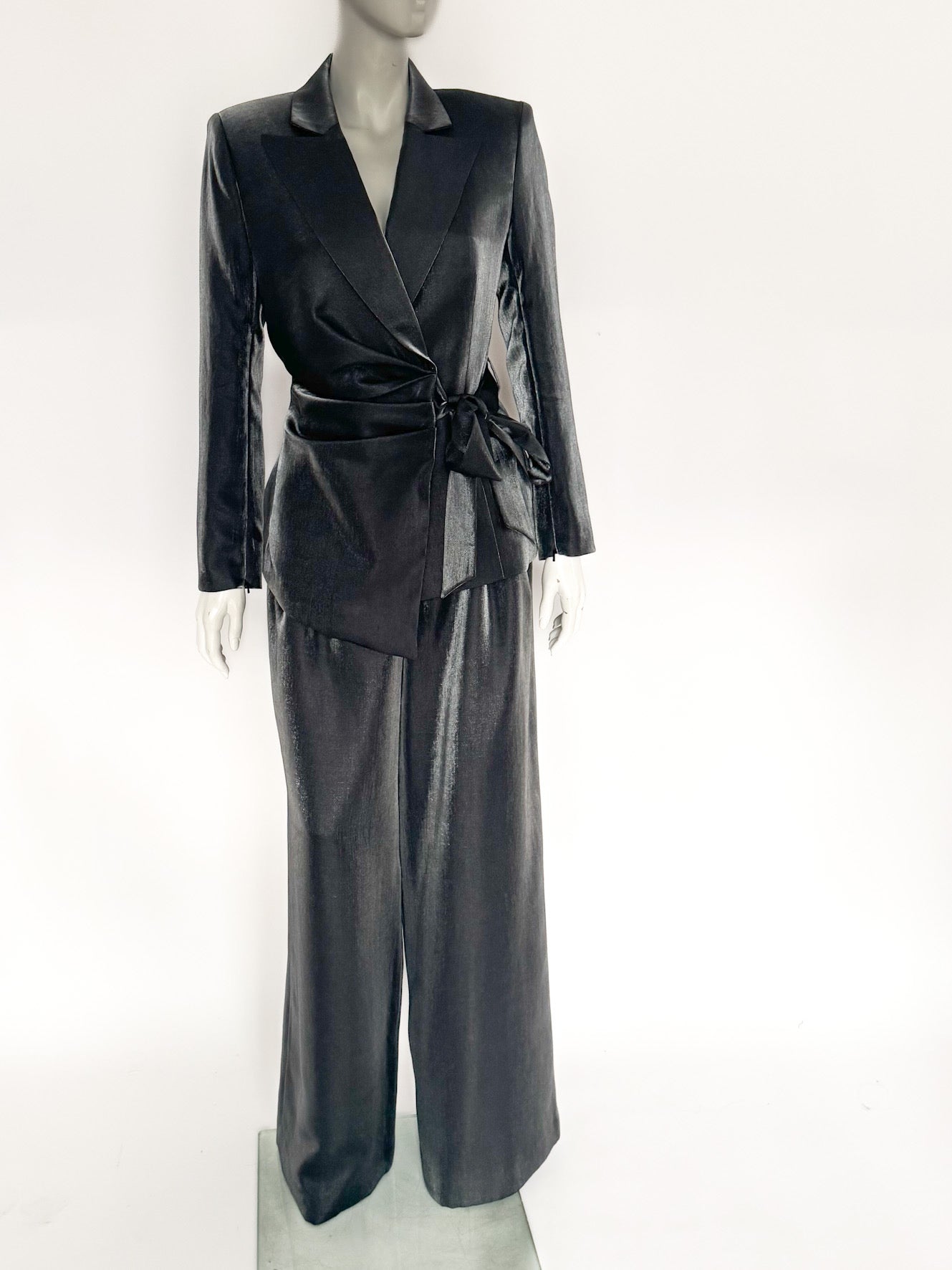 Blazerul are o croială lejeră, cu guler cu revere și închidere cu cordon în talie, ceea ce permite ajustarea delicată a siluetei. Un detaliu inovator îl reprezintă mânecile transformabile, prevăzute cu fermoar ascuns. Acestea pot fi deschise pentru a crea un efect elegant de pelerină, oferind libertate de mișcare și un aspect spectaculos.