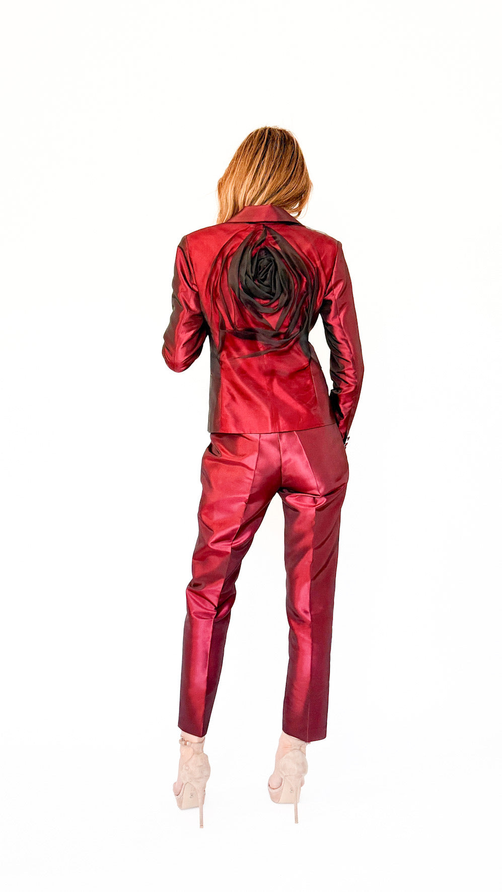 Blazerul are o închidere delicată într-un singur nasture, păstrând o estetică minimalistă în față, în timp ce spatele devine punctul central al designului. Materialul din tafta fină oferă structură, eleganță și un luciu subtil, evidențiind croiala impecabilă și detaliile realizate manual.